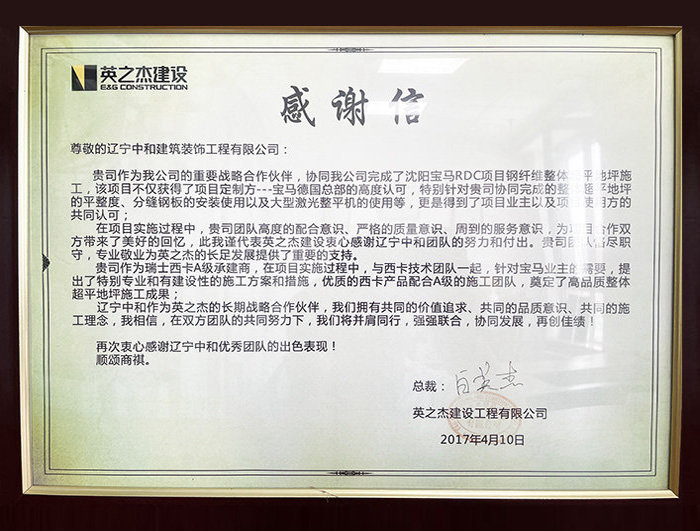 作為西卡整體地坪的核心承建商,公司所有的管理及施工團(tuán)隊(duì)均接受過西卡的管理、技術(shù)及實(shí)操培訓(xùn),同時接受西卡對我公司施工質(zhì)量與服務(wù)的監(jiān)督。
